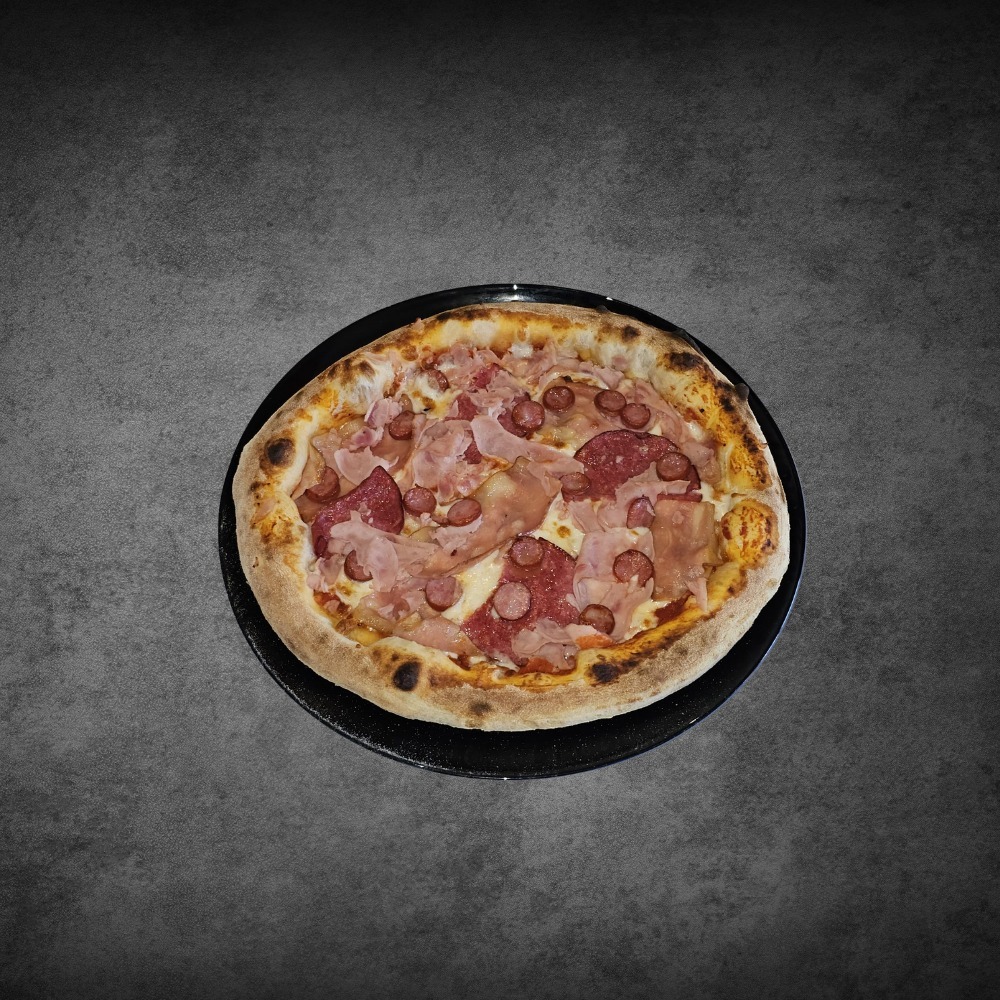 Ingrediente: Sos de roșii, mozzarella, bacon, salam, șuncă, cabanos