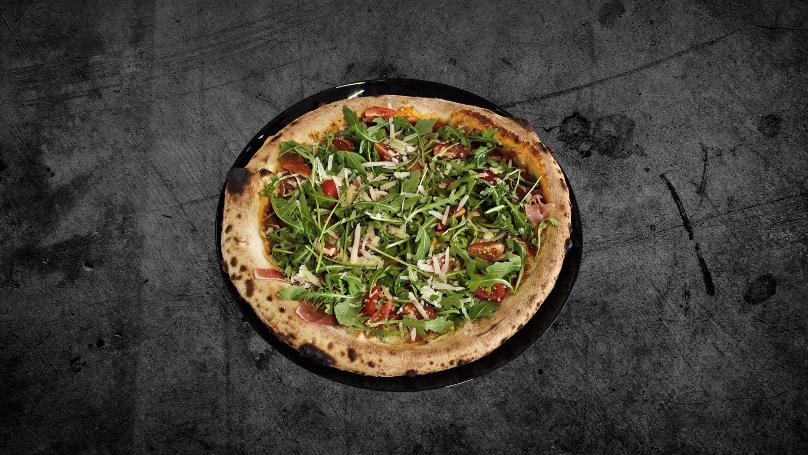 Sos de roșii, mozzarella, gorgonzola, prosiutto crudo, racola, roșii cherry, parmezan
