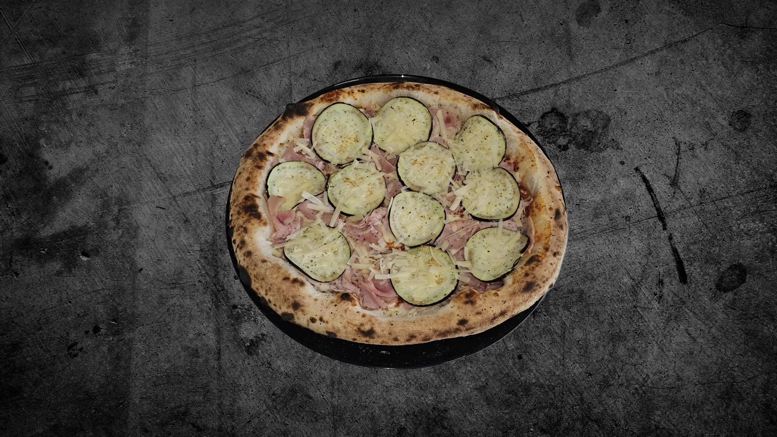 Sos de roșii, mozzarella, șuncă, vinete, parmezan Mărime: Standard 500g – 35 Lei XXL 1200G – 70 Lei